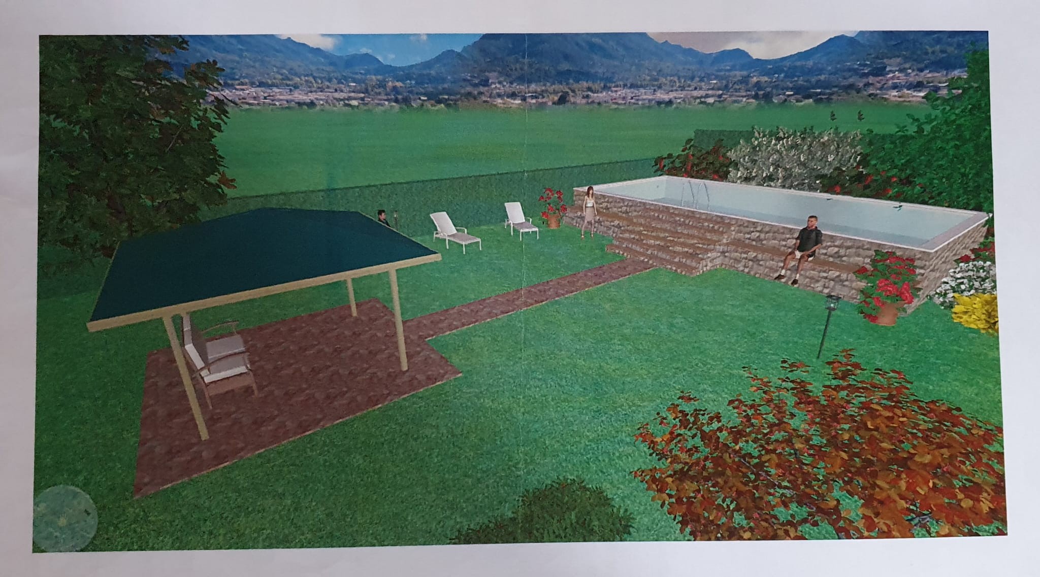 Giardino piantumato di 2000 mq, dependance adibita a deposito (22 mq), pergolato con posti auto (20 mq)